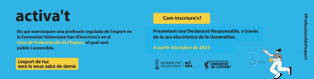 La Dirección General de Deporte de la Generalitat Valenciana recuerda que, en aplicación de la Ley 2/2022, de 22 de julio, y de su decreto de desarrollo, desde el 23 de octubre de 2025 está en marcha el Censo de Profesionales del Deporte y la Actividad Física de la Comunitat Valenciana.